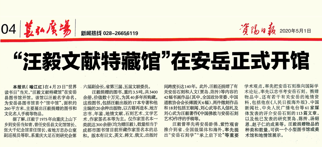 (《“”汪毅文献特藏馆“在安岳正式开馆》,载2022年5月1日《资阳日报》)