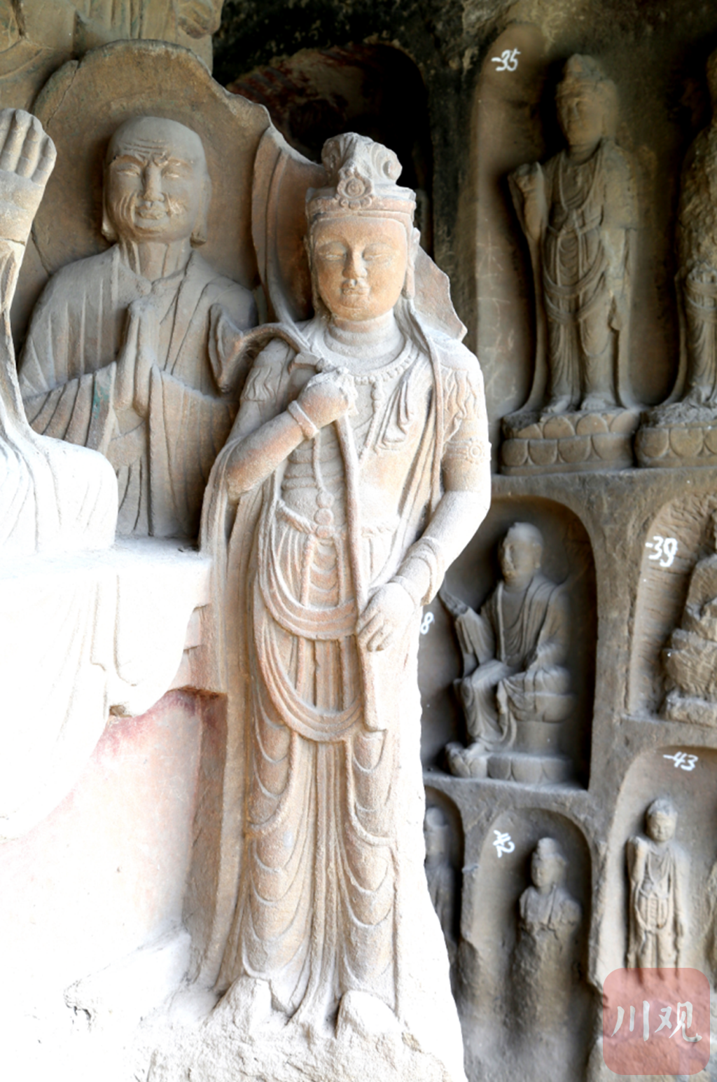 上世纪八十年代,著名美学大师王朝闻在千佛崖参观了这尊“持莲观音”像后大加赞誉,称其是与古希腊雕像断臂维纳斯比肩的“东方美神”,仔细看,又颇有几分“川妹子”的神韵,长发披肩,项圈环颈,手上臂着钏,身上严饰璎珞,下身穿贴体长裙。