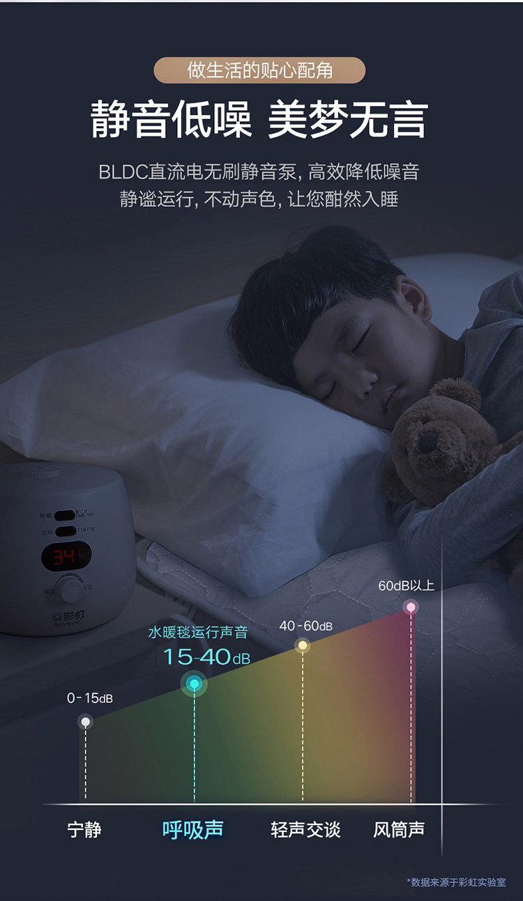 (图为水暖毯的分贝几乎等同于呼吸声)数据来源成都彩虹集团水暖毯专业实验室