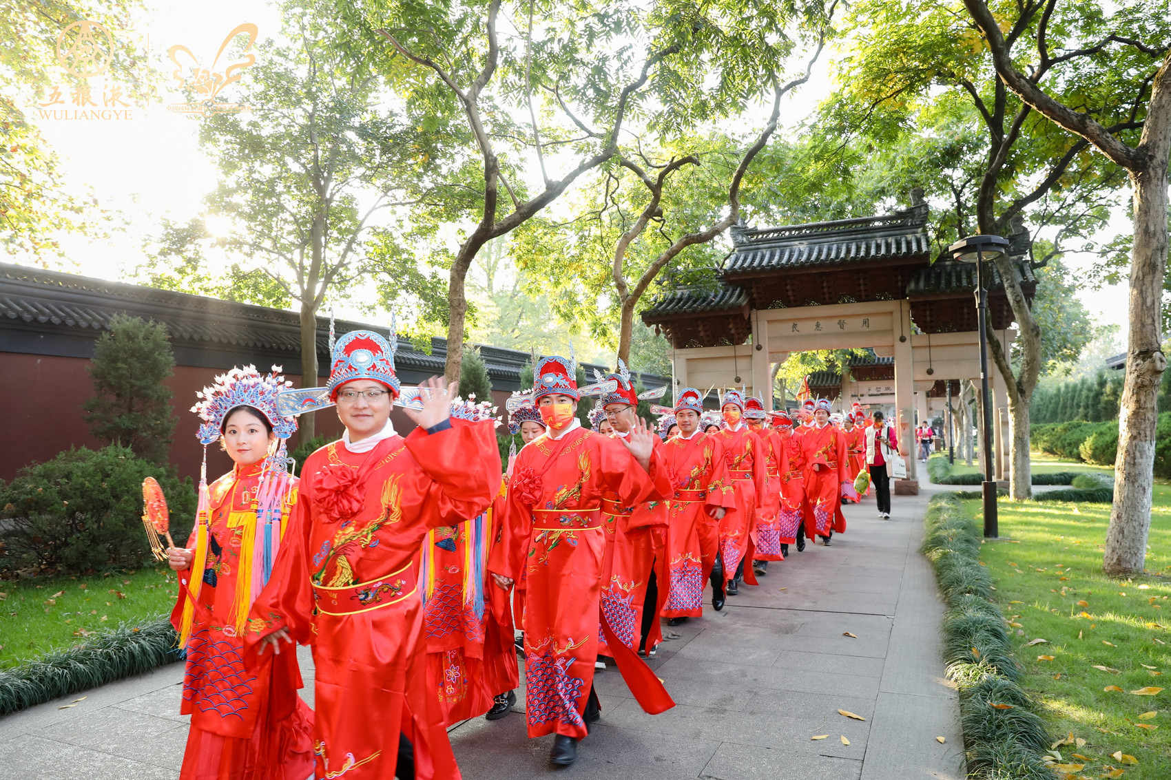 当天中午12时,杭州宋城景区内,欢快喜庆的民乐响起,演员扮演的“宋皇”率领文武百官以及宫眷队、宫女队、侍卫队、歌舞队出城,喜迎来自全国100座历史文化名城的100对新人的到来,带领百对新人盛装巡游,展现出具有中国传统文化特色的婚礼迎亲宏大场面。