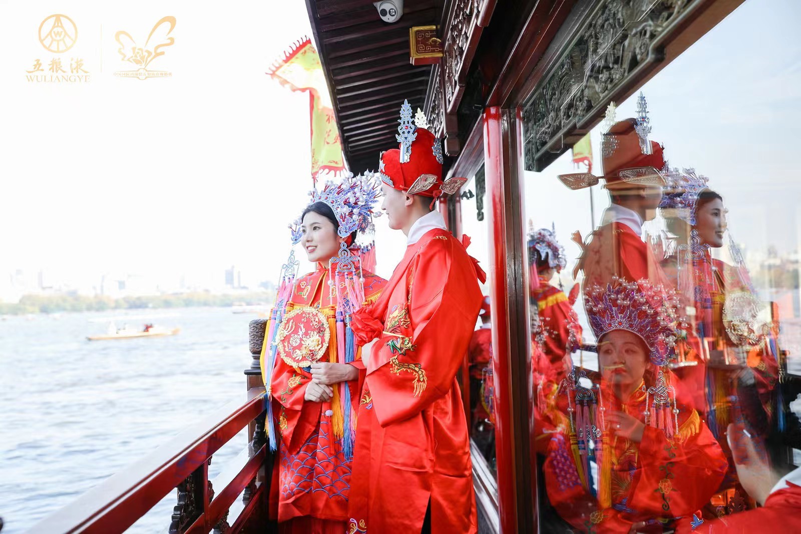 在中国人的生活中,美酒常陪伴着人生重要时刻,成为这些仪式的点睛之笔,渲染气氛,链接情感。在持续一天的大婚典礼过程中,“一杯五粮液美酒,祝福百样和美”的仪式感得到了良好的体现,钱塘江畔的宋城内外、西子湖畔的白堤千米红毯大道、西湖画舫的彩船……五粮液的印记在其中随处可见。