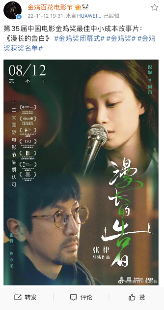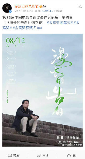 11月12日晚,第35届中国电影金鸡奖颁奖典礼暨2022年中国金鸡百花电影节闭幕式在福建厦门举行。由峨眉电影集团作为第一出品方的《漫长的告白》,此前共获得最佳中小成本故事片、最佳编剧、最佳女主角、最佳男配角四项提名,最终获得最佳中小成本故事片、最佳男配角(辛柏青饰立春)两项大奖。