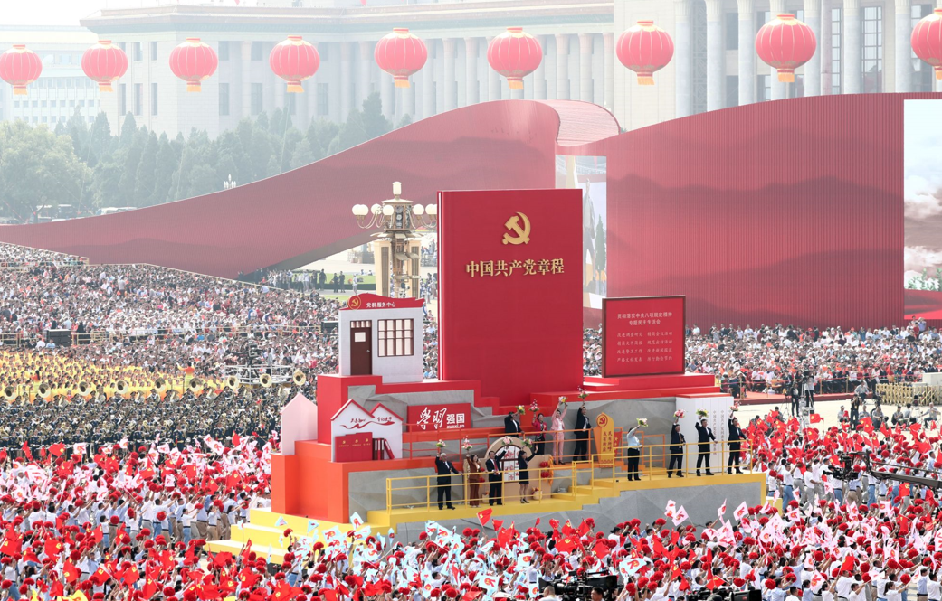 2019年10月1日上午,庆祝中华人民共和国成立70周年大会在北京天安门广场隆重举行。这是群众游行队伍中的“从严治党”方阵。