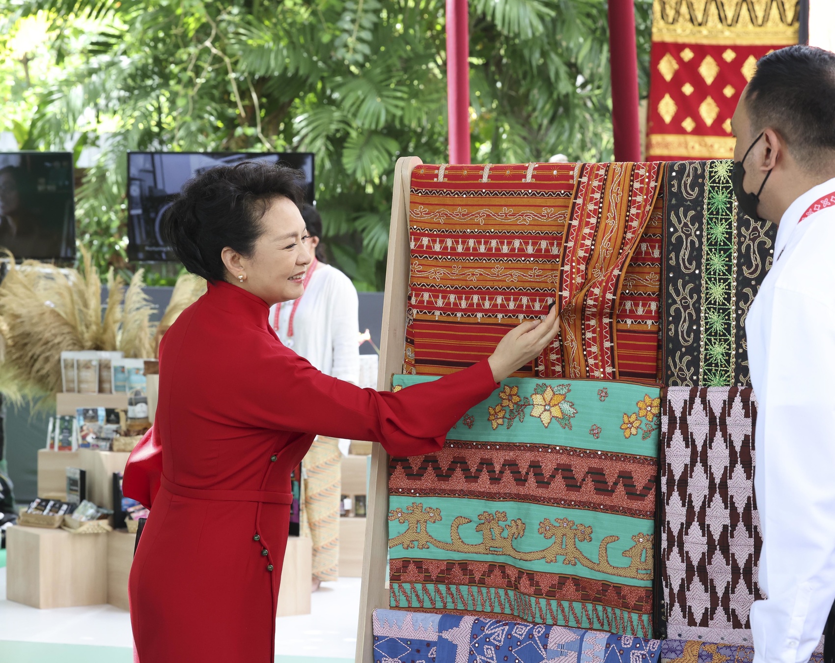 彭丽媛赞赏印尼将手工艺品制作与妇女赋能、摆脱贫困和生态保护相结合的理念,表示两国可以在相关领域加强交流合作,为地区产业扶贫、生态保护贡献力量。