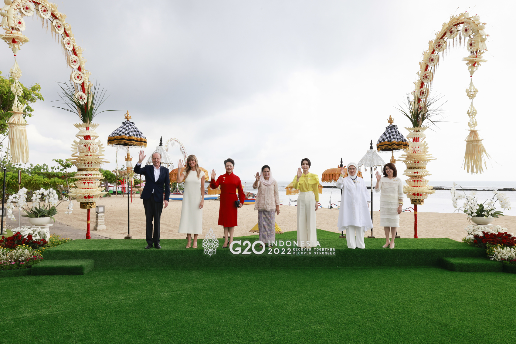 彭丽媛同其他领导人配偶一同欣赏巴厘岛特色舞蹈,以海天为背景集体合影。