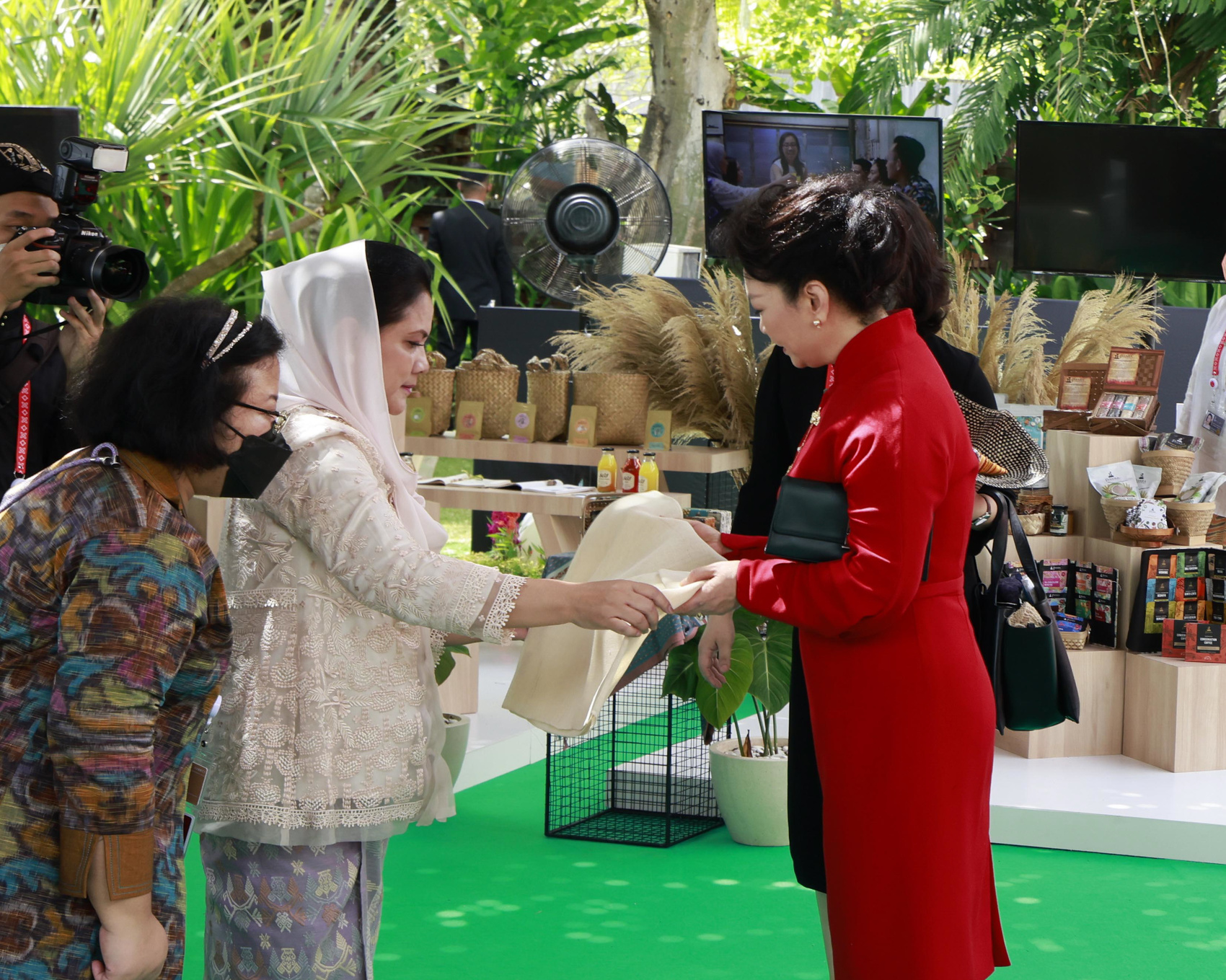 在伊莉亚娜陪同下,彭丽媛观看当地乐器、服饰、藤编、刺绣和生态食品展览,体验棕榈叶编织等印尼传统手工艺品制作。