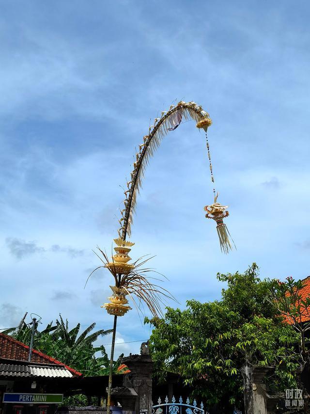 △每逢重大节日,巴厘岛就会装饰起蓬葭。它由椰子叶和鲜花制作而成,表达巴厘岛人对万物之神的祝福和感激。(总台央视记者韩锐拍摄)