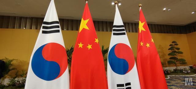 △会见现场的中国和韩国两国国旗。(总台央视记者耿小龙拍摄)