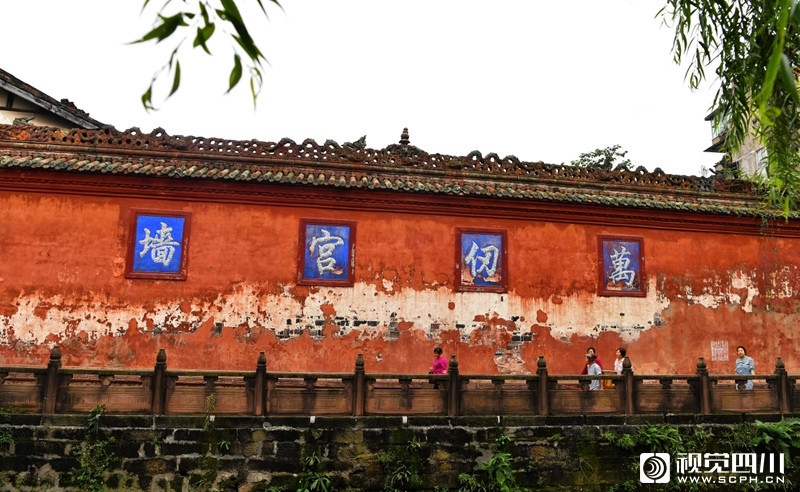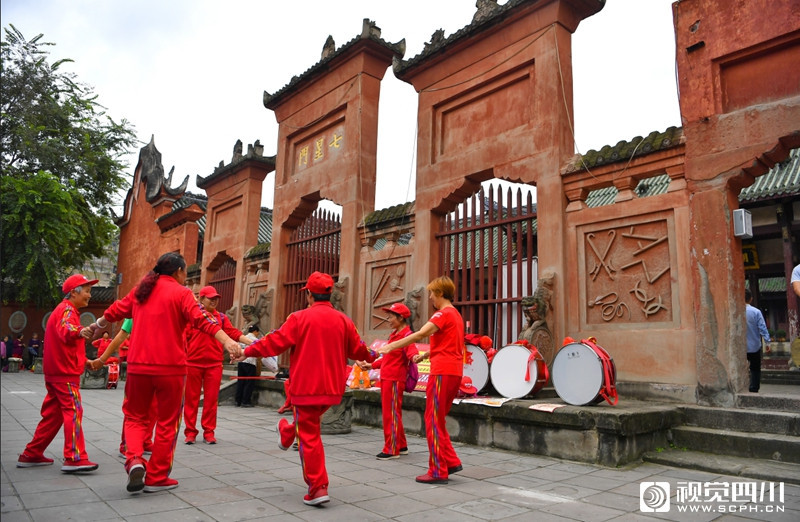 此时,距离资中文庙仅有百米之隔的武庙中,斑驳的木墙、屋顶青黄色琉璃瓦满是岁月的痕迹,翼角起伏交叉,屋脊装饰精美,整个建筑显得分为雄伟壮观。而仅一道木栏围墙相隔的门外广场,早已成为周边居民健身锻炼的“根据地”,透过栅栏缝隙向外望去,不少老人打着太极、跳着广场舞,好不热闹,相较文庙、这栋从嘉靖年间就存在的武庙与资中人的距离似乎更近。