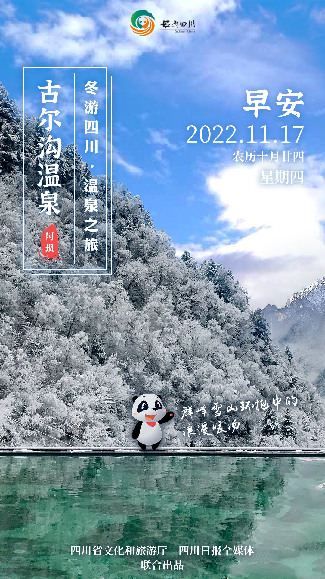 11月17日,星期四。今天冬游四川日历海报带大家去体验,穿越了无数山涧后依然热气缭绕的古尔沟温泉,体验群峰雪山环抱中的浪漫暖汤。