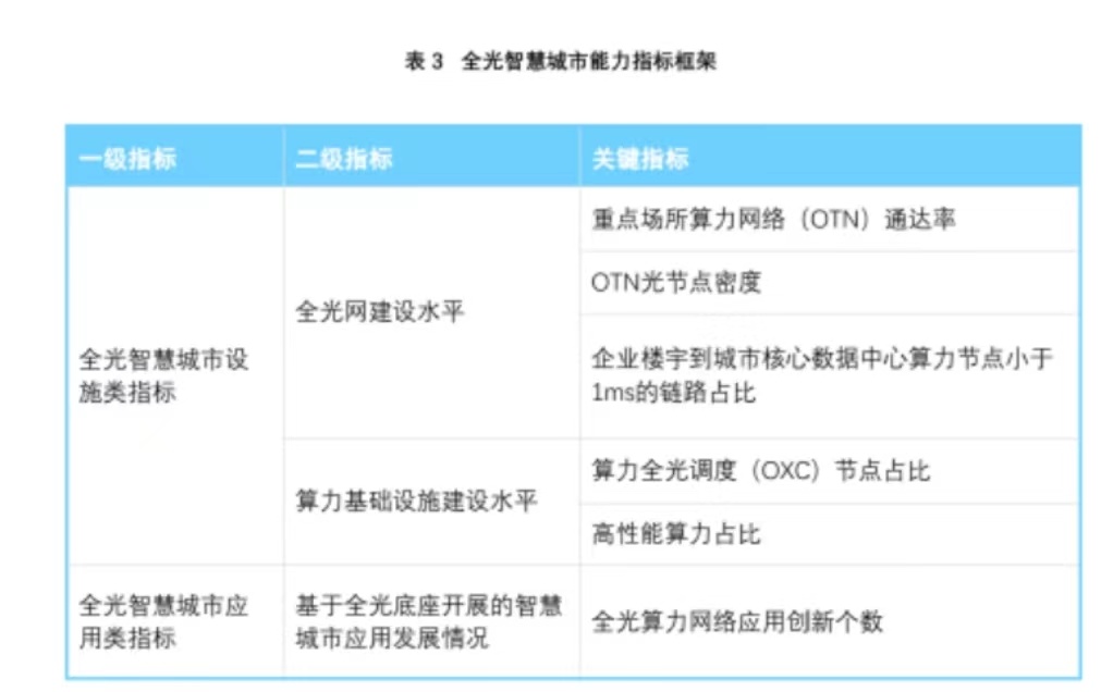 全光智慧城市设施类指标主要基于全光网、算力基础设施建设水平来衡量。目前,全国已经有多个省和直辖市积极开展了全光智慧城市建设,并布局了高品质全光运力网络和智算中心、超算中心等全光智慧城市的关键基础设施。指标从重点场所算力网络(OTN)通达率、OTN光节点密度、企业楼宇到城市核心数据中心算力节点小于1ms的链路占比、全光调度(OXC)节点占比、高性能算力占比等方面考察各地算网协同、业务按需接入、灵活调度能力。