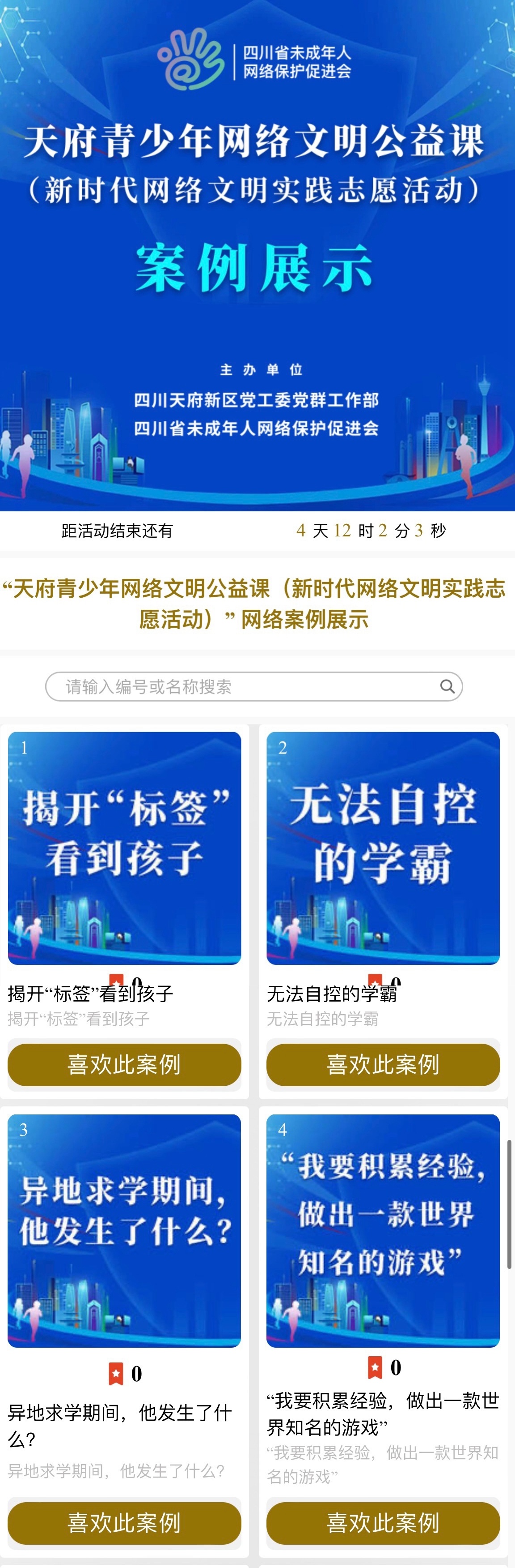 自11月10日,四川省未成年人网络保护促进会与四川天府新区党工委党群工作部开展“天府青少年网络文明公益课(新时代网络文明实践志愿活动)”网络案例征集活动以来,共收到学校、互联网企业、科研机构、心理咨询平台等单位报送的网络案例400余个,这些案例内容广泛,涵盖网络不理性消费、网络沉迷等不同领域,覆盖我省21个市(州)。