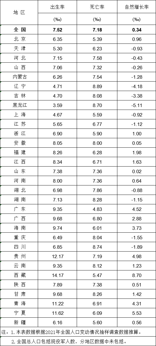 2021年各省区市出生率、死亡率、人口自然增长率 数据来源:《中国统计年鉴2022》