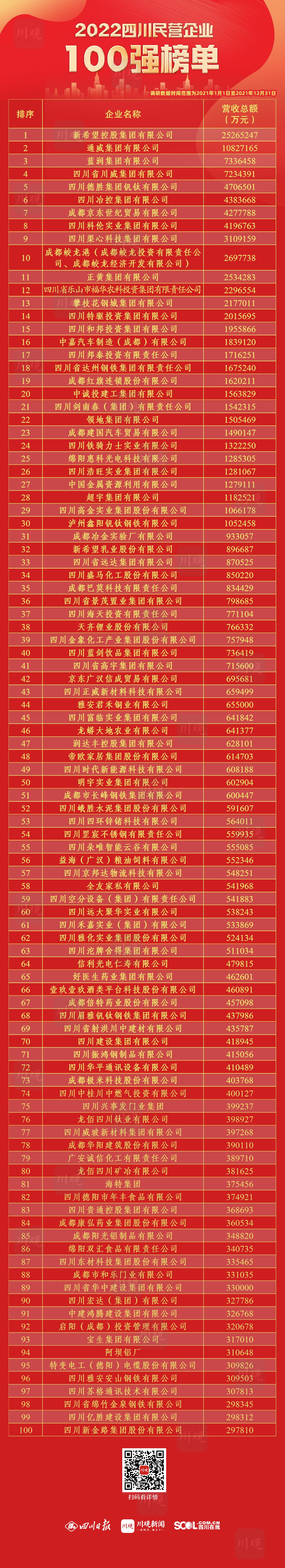 11月18日上午,由四川省工商联主办的2022四川民营企业100强发布会在成都举行。会上正式公布了2022年四川民营企业100强榜单。其中,新希望控股集团有限公司(2526.52亿元)、通威集团有限公司(1082.72亿元)、蓝润集团有限公司(733.65亿元)位列营业收入前三名。