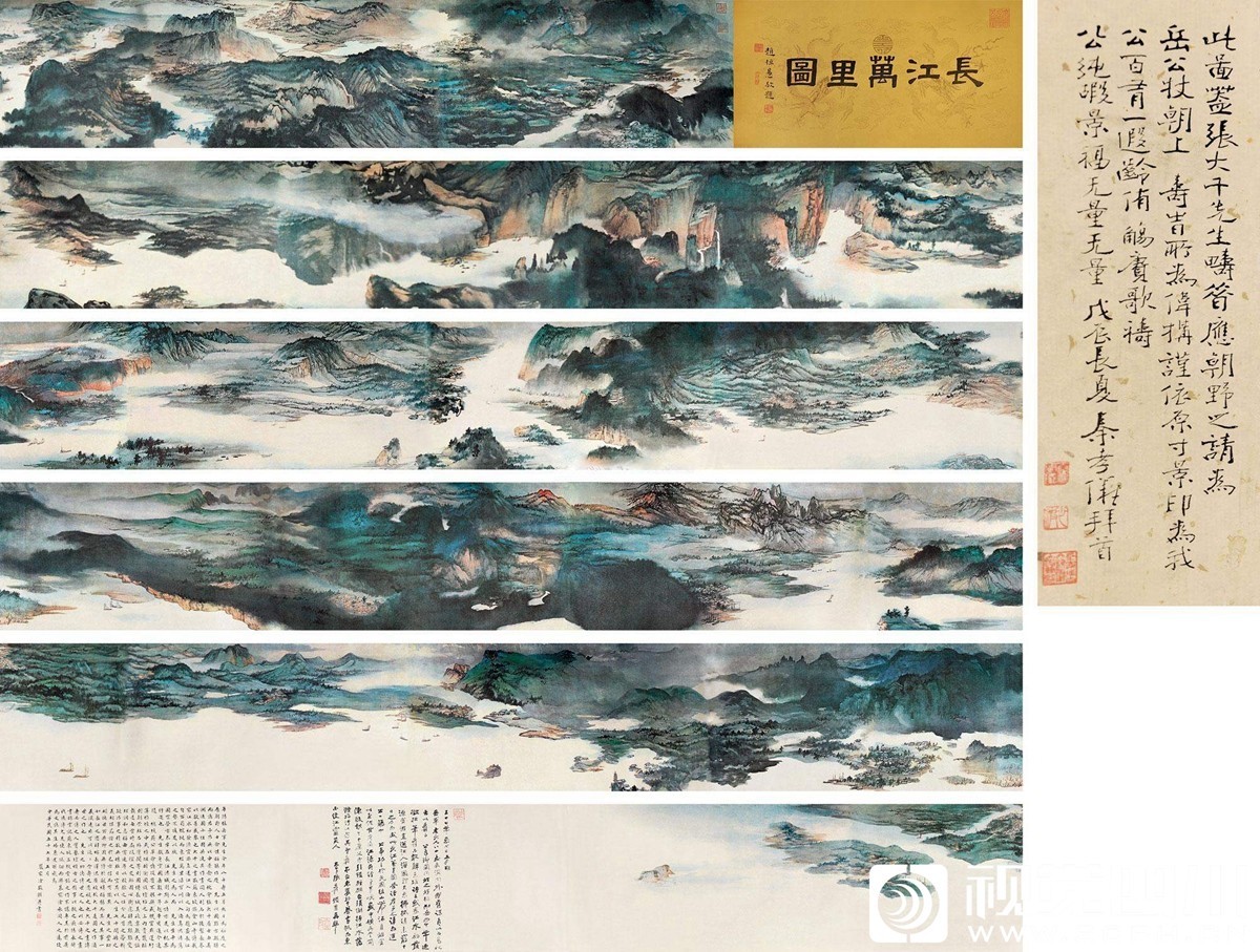 而在五十二年前,张大千先生早就大笔一挥,在画卷上将成渝两地紧密相连,这幅画就是在张大千博物馆里通过电子屏展现的《长江万里图》。张大千先生19岁那年,从成都出发,走到了重庆,在他70岁的时候,凭借回忆,创作出了该画作。当然,在这幅画作里,除了能够一栏成渝风貌,我们还能顺江而下,领略长江万里的涛涛波澜,沿途的壮美风光。