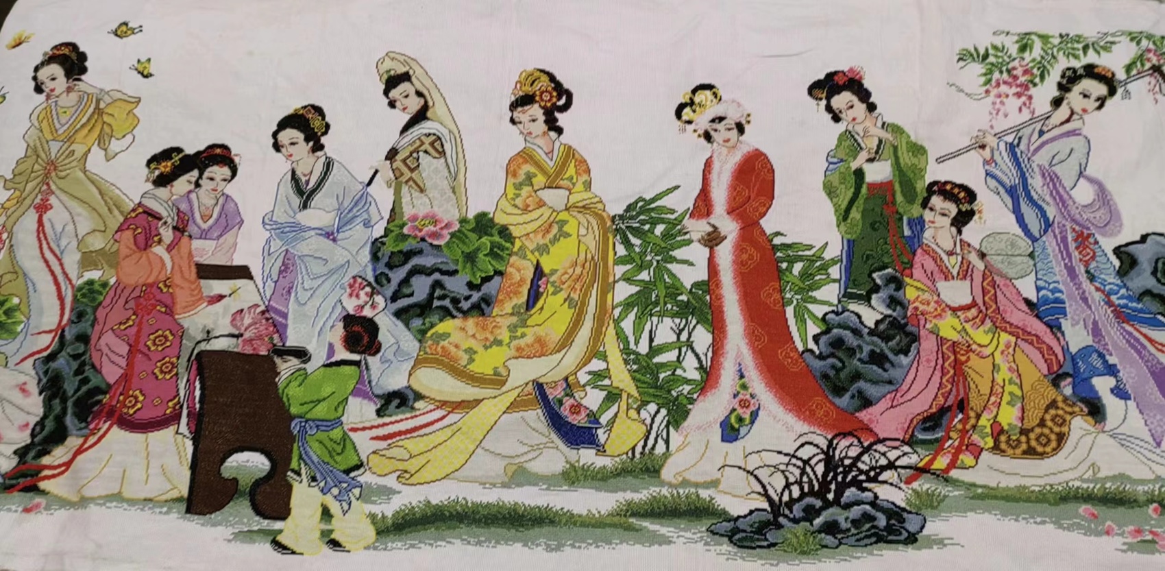 《金陵十二钗》长2.5米,宽1米,绣品中的十二位女子,有的独立花间,有的吟诗作对,姿态各异、栩栩如生,极具中国古典韵味。绣品正反面干净整齐,绣线均匀排列,针脚紧密,做工细致。