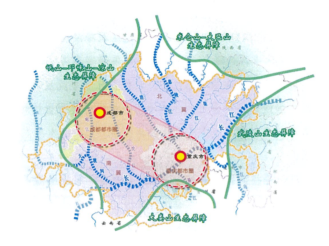 其中,“双圈”为重庆都市圈和成都都市圈,“两翼”分别为北翼(即川东北、渝东北)、南翼(雅安、乐山等地区),“四屏”指以盆周的岷山—邛崃山—凉山、米仓山—大巴山、武陵山、大娄山等四片为重要生态屏障,“多廊”则是以长江干流及其重要支流等为廊道。