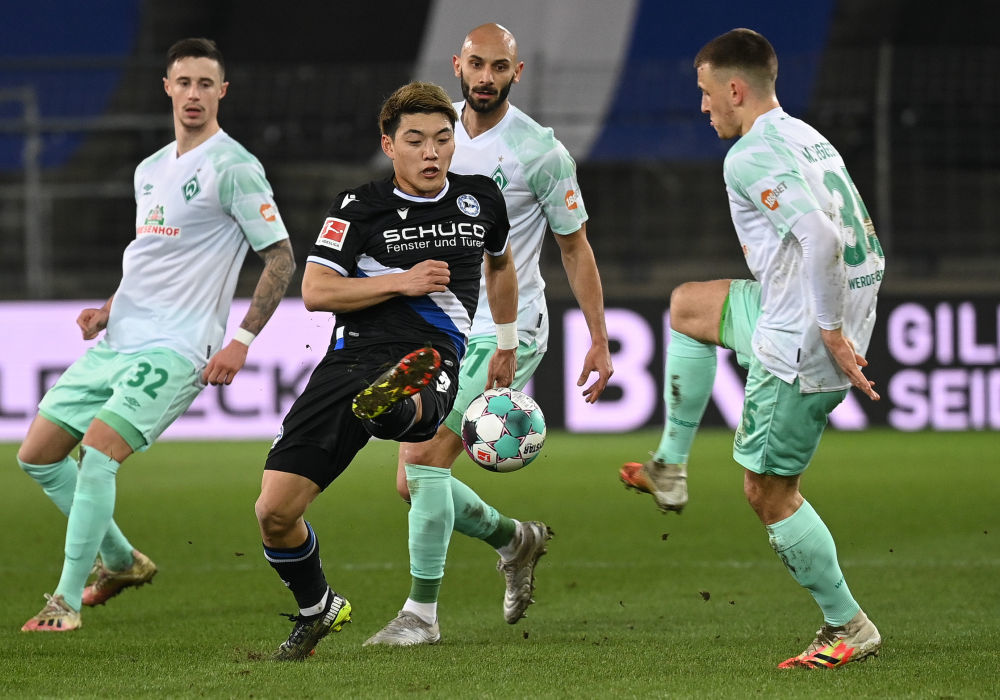 2021年3月10日,当时效力于比勒菲尔德队的日本球员堂安律(前左)在德甲比赛中带球突破。他现在效力于德甲弗赖堡俱乐部。新华社发(乌尔里希·胡夫纳格尔 摄)
