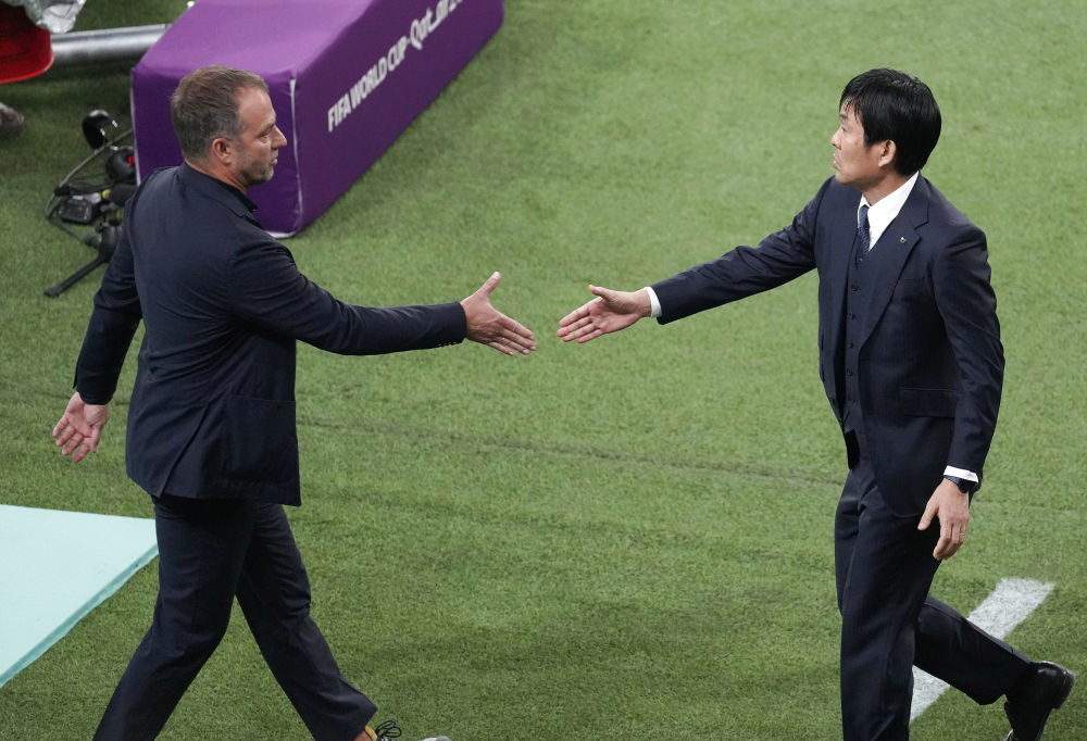 11月23日,德国队主教练弗利克(左)与日本队主教练森保一在赛后握手。新华社记者陈诚摄