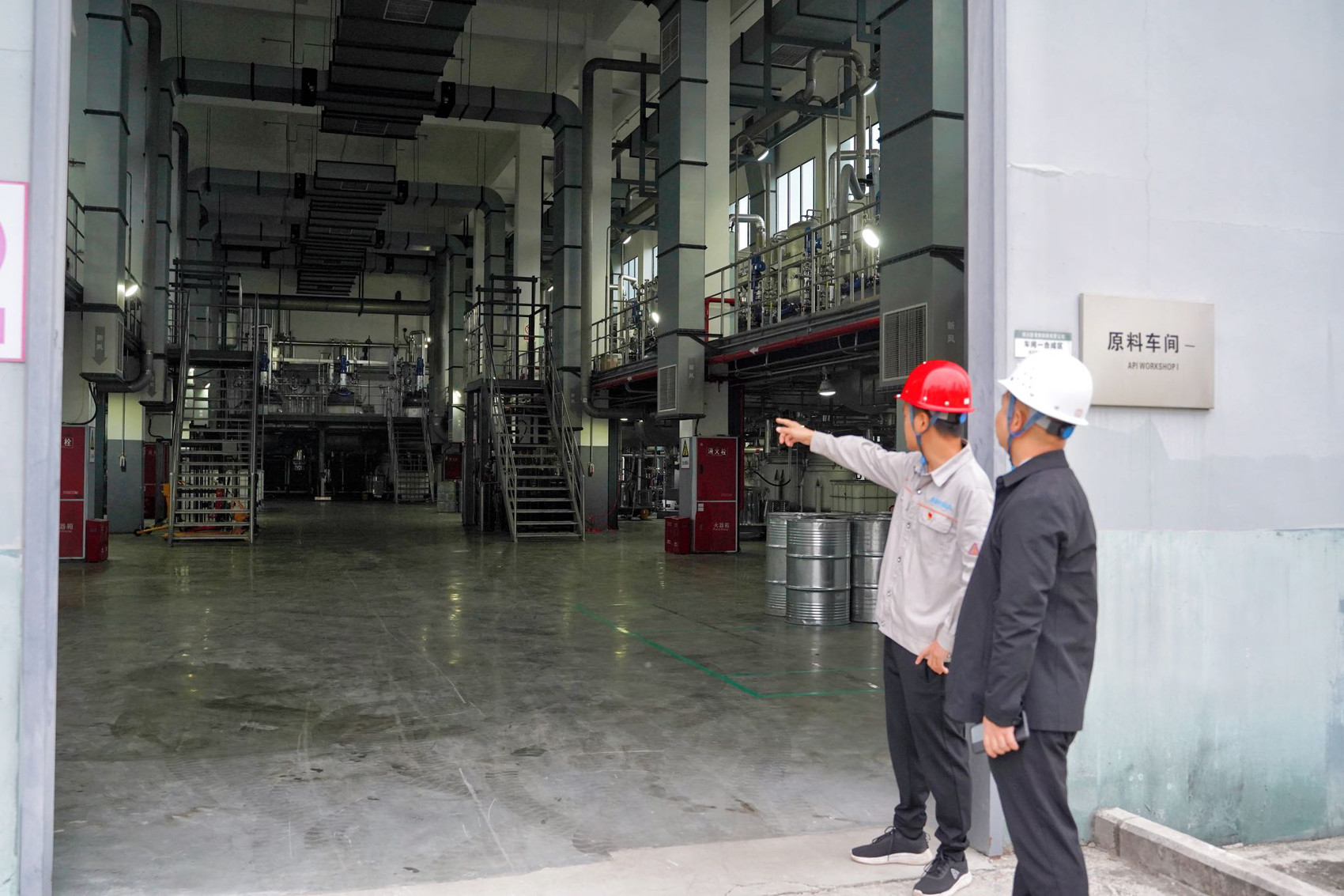 四川新青阳制药有限公司原料车间外,蒋俊认真聆听负责人(左一)提出的问题,并协调解决。 吴迪 摄