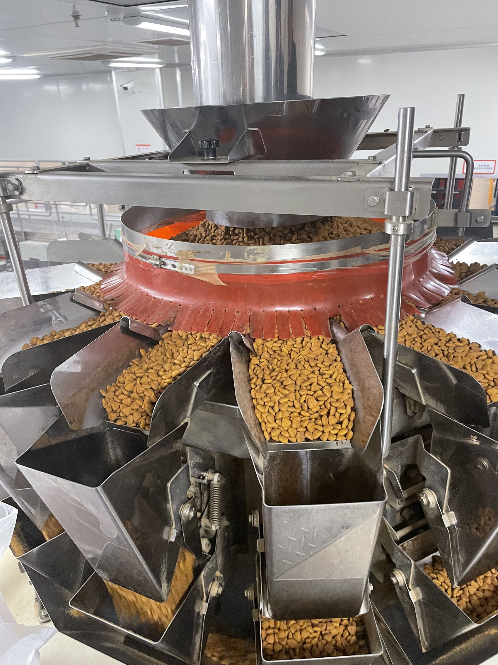 在包装车间,一种看起来像“八爪鱼”的秤一刻不停,“你看它有14个斗,每个斗称重的重量不同。”潘渝锋说,这是一种电脑组合秤,3—4个斗组合称重,1秒钟就能精准称出2.5公斤的宠粮,“有1万多种组合。”