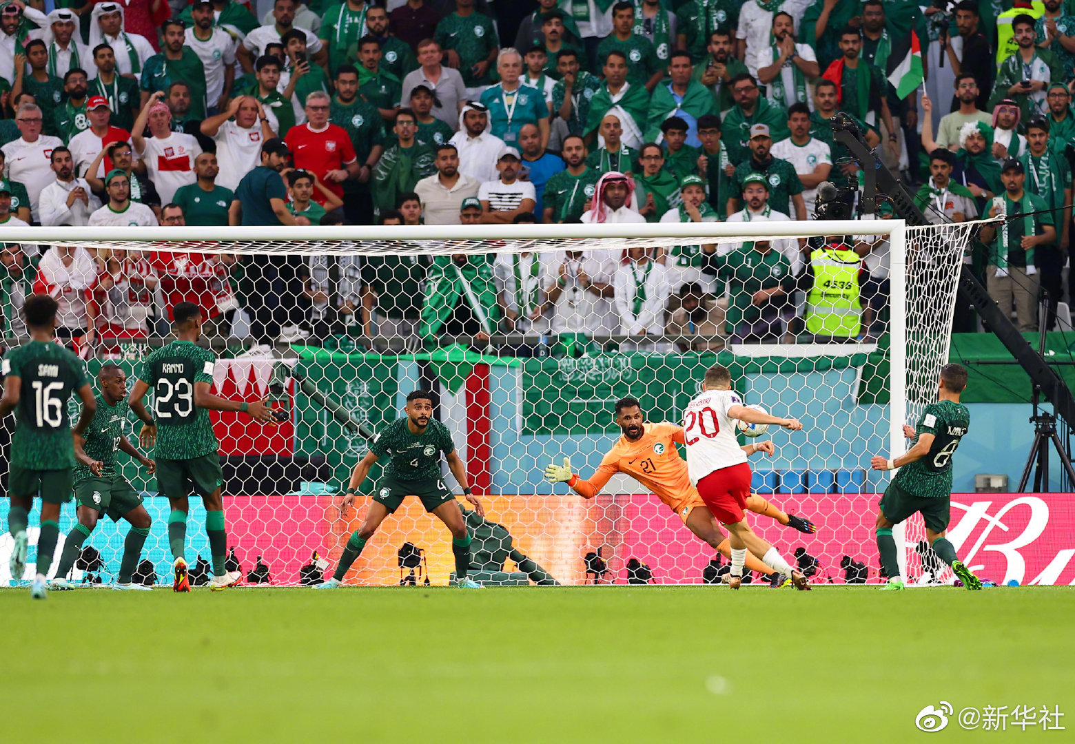 顶住沙特阿拉伯队一连串攻势之后,波兰队的攻势才渐有起色。第39分钟,莱万多夫斯基禁区右侧底线处倒三角回传,泽林斯基门前扫射,率先打破僵局——这是波兰队本场比赛首次打在门框内的射门。第43分钟,沙特阿拉伯队球员谢赫里在禁区内被推倒,桑帕约在观看视频回放后判罚点球。可惜达瓦萨里操刀主罚点球被什琴斯尼神奇扑出。据统计,什琴斯尼也成为本届世界杯第三位扑出对手点球的门将,此前两位分别是墨西哥门将奥乔亚、以及比利时门将库尔图瓦。
