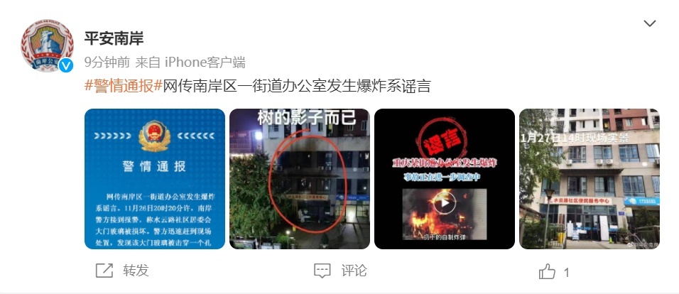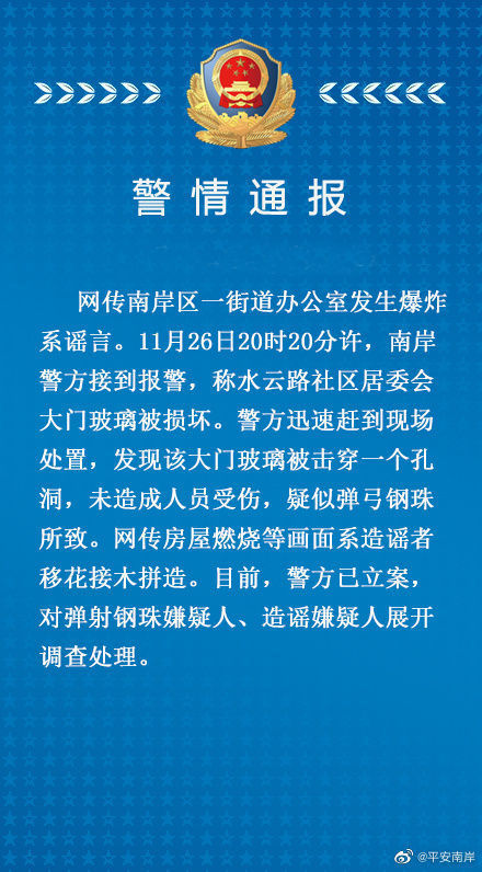 据平安南岸微博11月27日消息,网传重庆市南岸区一街道办公室发生爆炸系谣言。