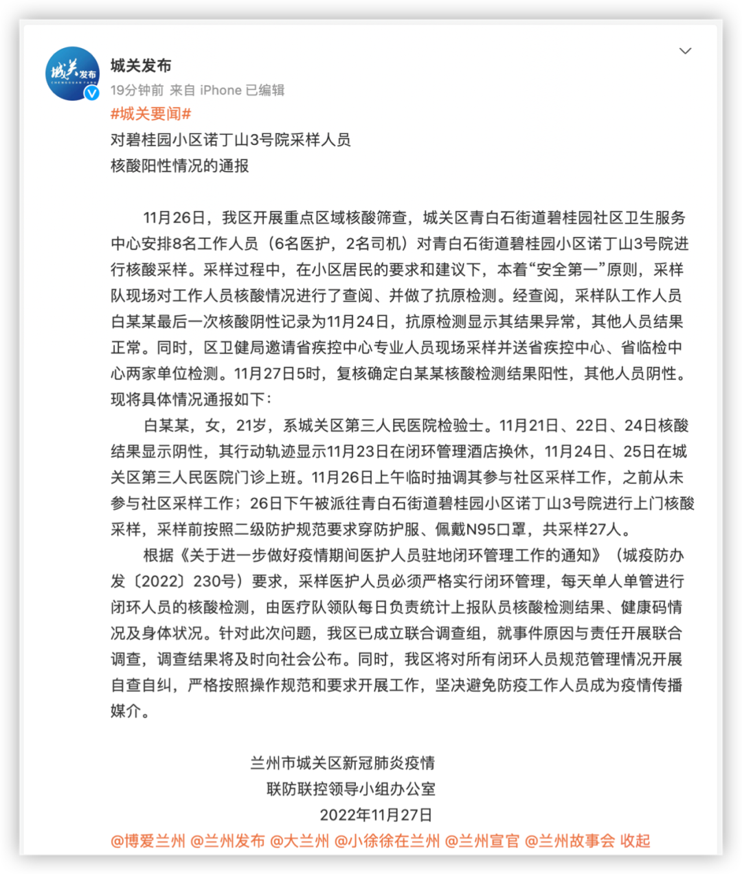 据兰州市城关区官方微博@城关发布,11月27日,城关区疫情联防联控领导小组办公室通报采样人员核酸阳性的相关情况: