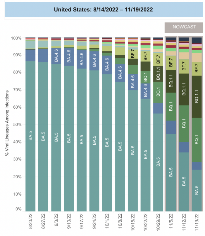 美国疾控中心表示,早前主导美国的奥密克戎BA5型毒株正在被其亚型突变株快速取代。美国CSH实验室的报告指出,其中BQ1和BQ1.1型突变株的传染力是BA5型毒株的7倍,且具有更强的逃逸性。这些新亚型正在美国人口密集的一线城市快速传播。