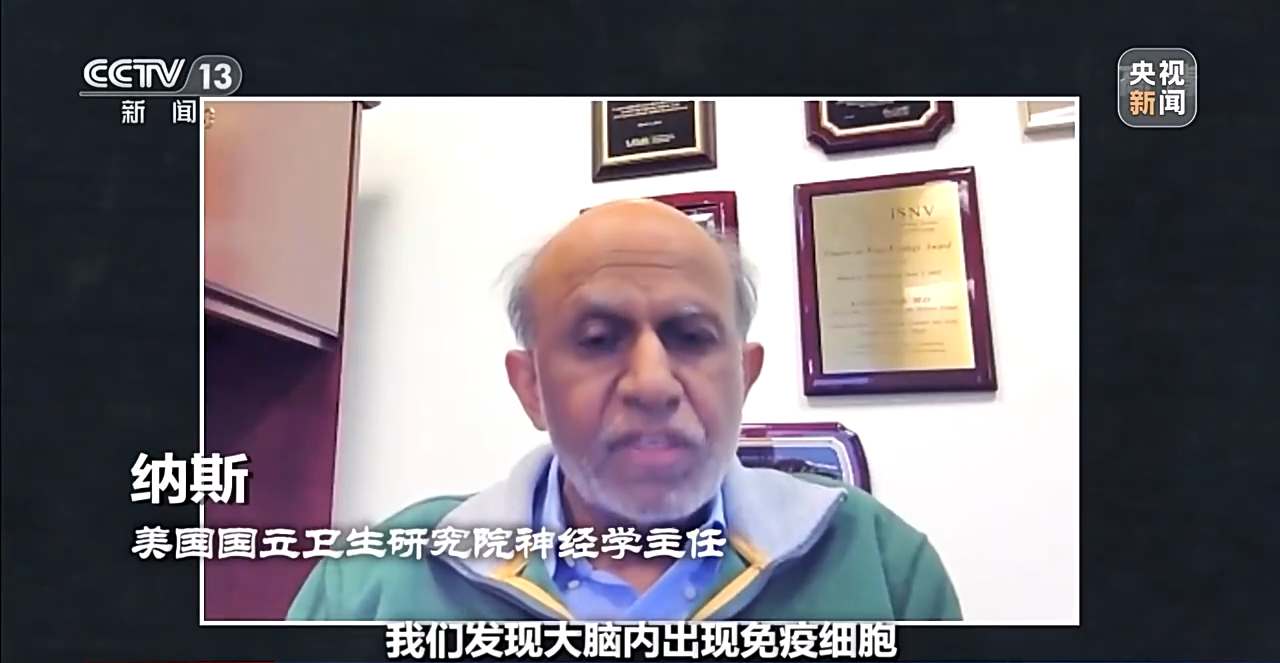 美国国立卫生研究院神经学主任 纳斯:脑部血管被损坏,大脑周围发现炎症细胞,我们发现大脑内出现免疫细胞,我们还发现抗体附着在血管上,而它们曾对血管发起攻击。