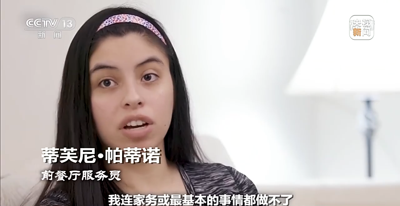 前餐厅服务员 蒂芙尼·帕蒂诺:我连在家生活都勉强,我连家务或最基本的事情都做不了,我该怎样去工作,我怎么可能保住工作?我之前的职业,我是个服务员,那可是个体力活,我要从一个桌子跑到另一个桌子,一干就是好几个小时,从下午四点干到午夜,我现在做不了这样的工作。
