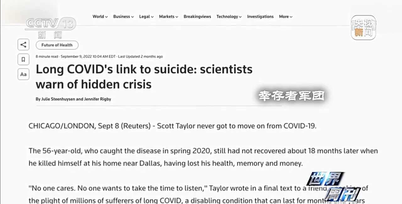 “幸存者军团”是一个由“长新冠”患者组成的互助组织,今年5月,该组织发起了一项“长新冠与自杀关联性”的调查,在近 200名受访者中,有44%的人表示他们认真考虑过自杀。原因是这些人认为,他们已经不再是患病前的自己。没有尽头的“长新冠”症状的折磨促使他们形成了自杀的想法。