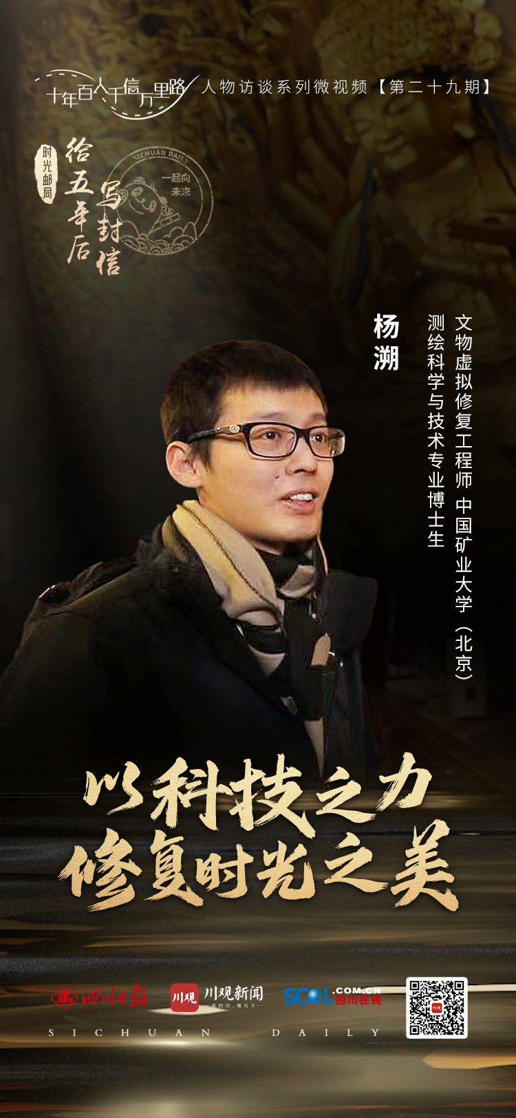 对于未来5年,杨溯有着一个更大的目标,为安岳石刻艺术等文物制作“族谱”。他在给五年后的自己的信中写道:让大家不遗忘任何一处文化遗产,铭记住中华民族历史长河中最宝贵的财富。