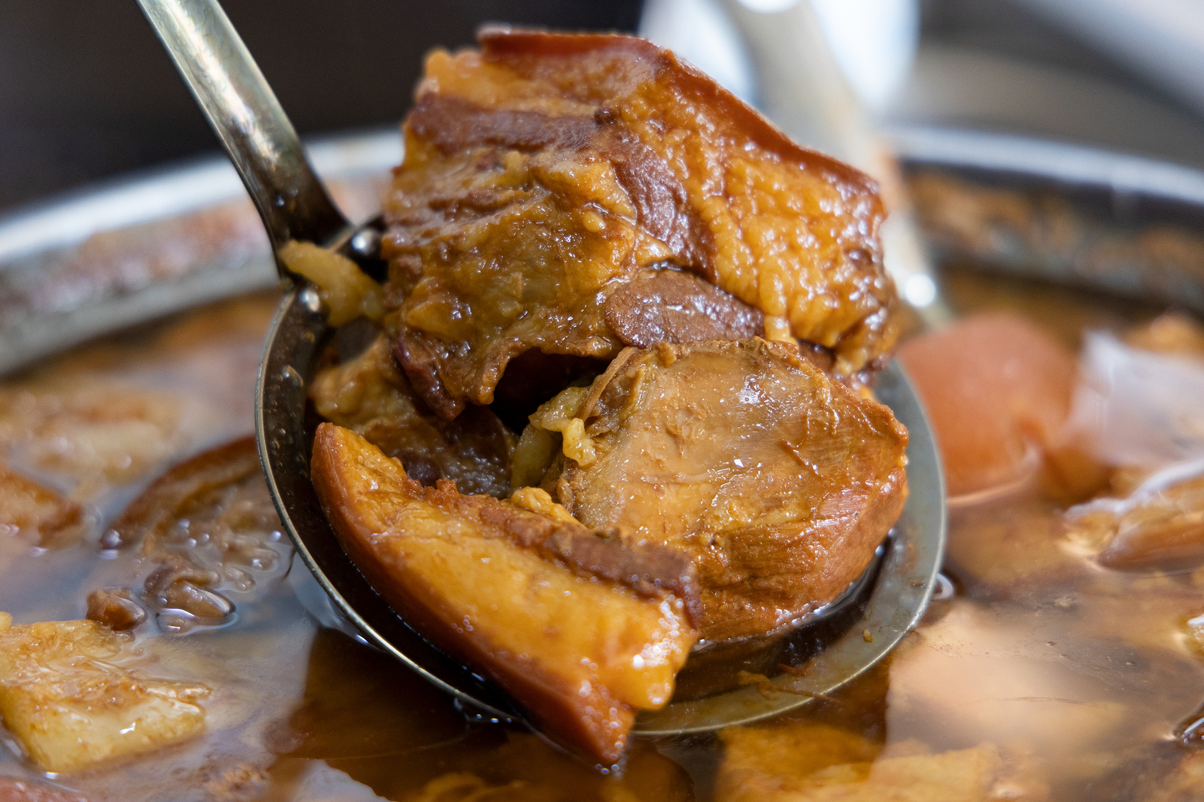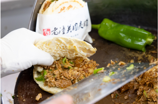 “有肥瘦相间款,有纯瘦肉款,还可以多加一份肉。”正在透明橱窗里忙碌的老板兼大厨任建新动作熟练,只见他把卤肉放在菜墩上,“咚咚咚”几声,卤肉被切成了更加细小的颗粒。因使用频繁,菜墩中间已经形成一个凹槽。取上适量卤肉,任建新迅速放进已经预制好的烧饼中。一套动作下来,不到一分钟时间就能让垂涎欲滴的吃货们吃上一口皮酥里嫩的老潼关肉夹馍。