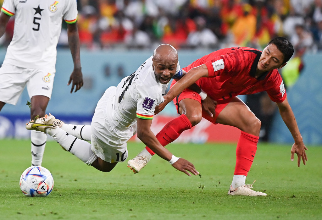 11月28日,韩国队球员郑又荣(右)与加纳队球员安德烈·阿尤拼抢。当日,在卡塔尔赖扬教育城球场进行的2022卡塔尔世界杯足球赛H组比赛中,韩国队对阵加纳队。新华社记者 陈诚 摄