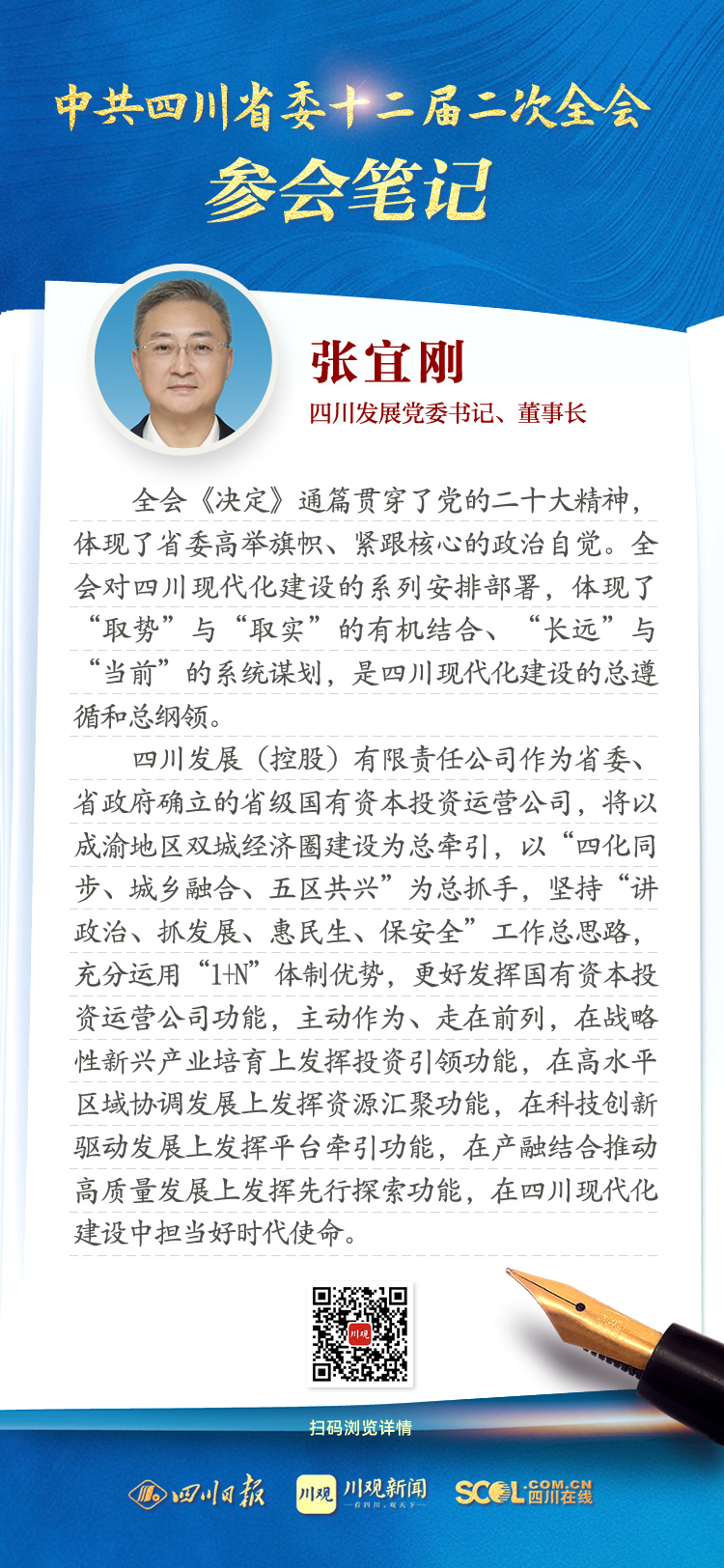 全会《决定》通篇贯穿了党的二十大精神,体现了省委高举旗帜、紧跟核心的政治自觉。全会对四川现代化建设的系列安排部署,体现了“取势”与“取实”的有机结合、“长远”与“当前”的系统谋划,是四川现代化建设的总遵循和总纲领。