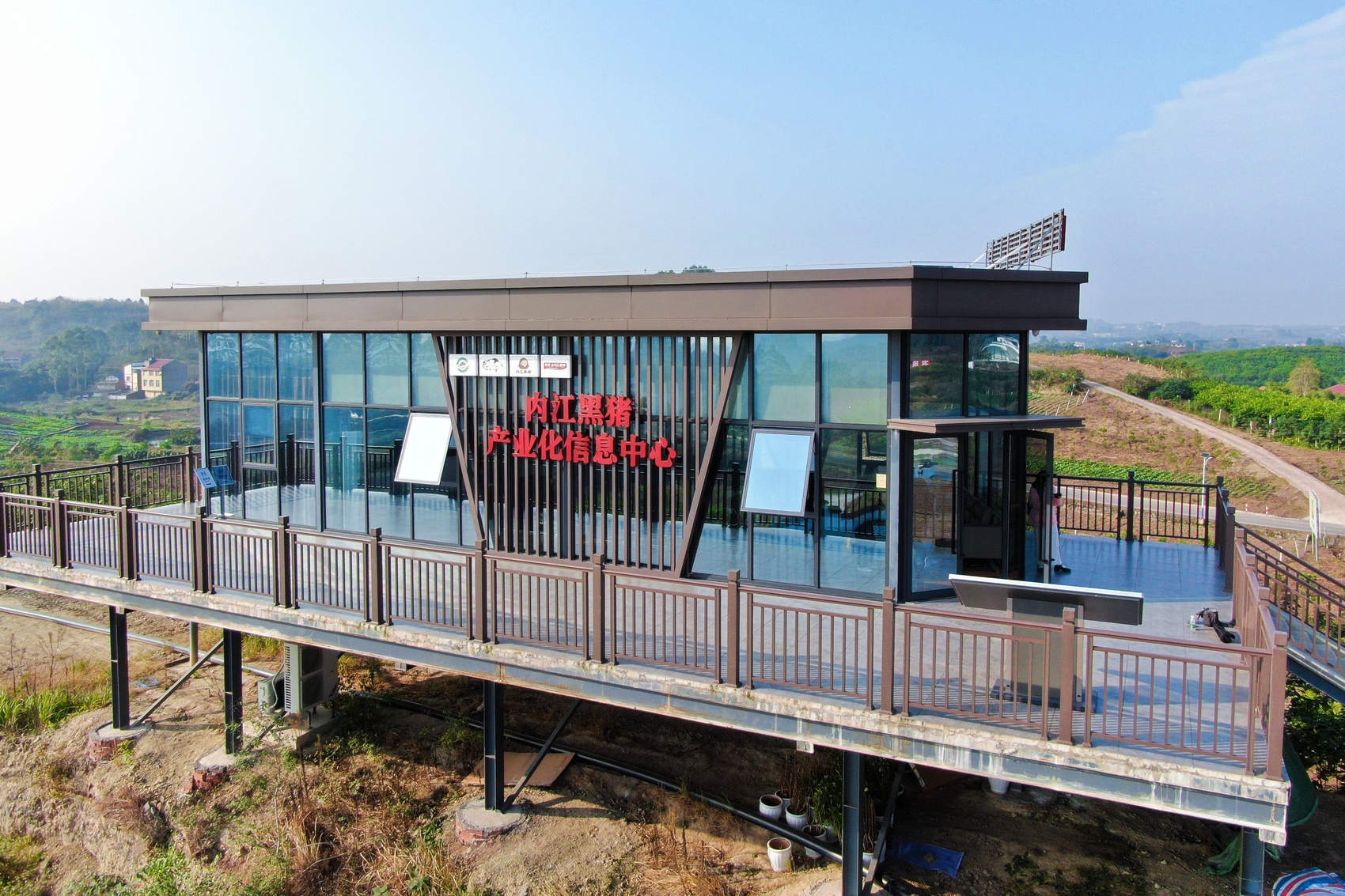 刚到入园口,“内江黑猪小镇”几个字十分醒目,一排排中式建筑风格的生猪养殖场迎面而来,高脊飞檐之下的养殖场住着一头头内江黑猪。站在园区最高处的内江黑猪产业信息化中心眺望,祖代场、保种场、扩繁场、饲草种植区等尽收眼底,这些就是内江黑猪的“产房”“月子中心”“卧室”等。