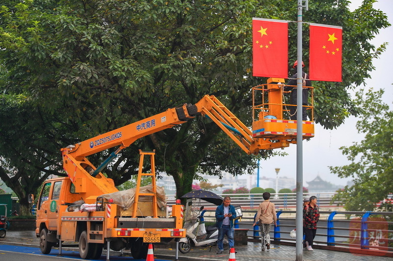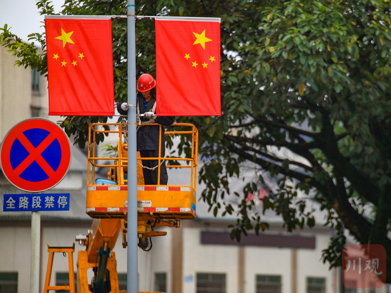 国庆至,红旗飘。9月28日,在雅安市雨城区临江路,工作人员正在相关机械的辅助下悬挂国旗。