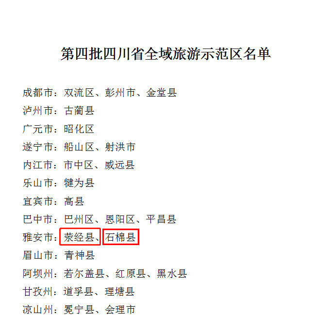 12月5日,从四川省文化和旅游厅获悉,根据省级综合考评验收结果和公示情况,雅安市荥经县、石棉县成功创建为第四批省级全域旅游示范区。