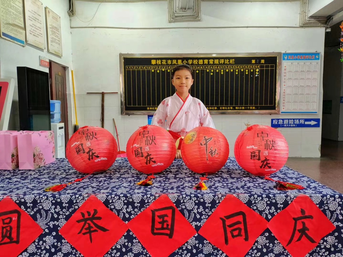 “但愿人长久,千里共婵娟……”当天上午,悠扬婉转的歌赋中,数十名小学生手提五彩花灯惊艳亮相。这些花灯形态各异,造型独特,由凤凰小学的孩子们自己动手制作。校园入口处,是学校精心布置的花灯观赏区,专门展示孩子们的巧思,格外引人注目。