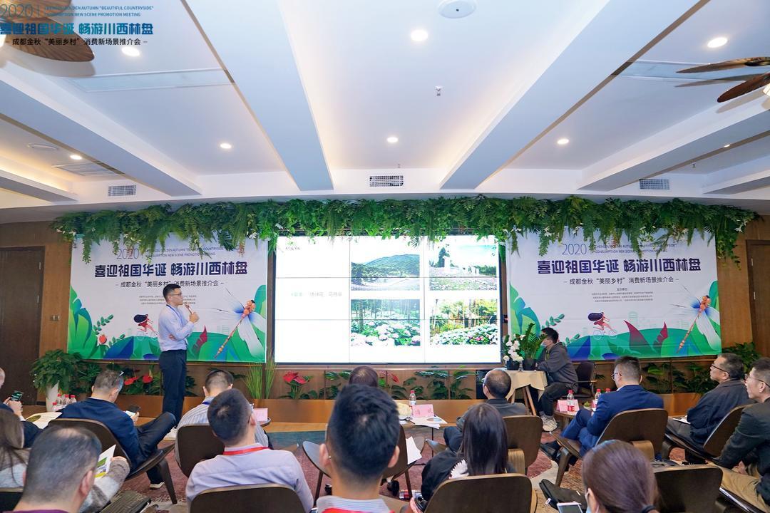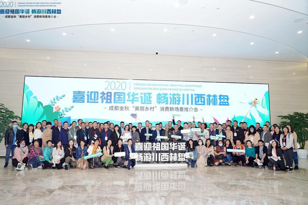 9月28日,在龙泉山城市森林公园丹景台,30余家在蓉省、市旅行社负责人和30家乡村消费新场景经营主体代表荟聚一堂,参与以“喜庆祖国华诞·畅游川西林盘”为主题的2020成都新经济“双千”系列发布会乡村消费新场景推介专场活动,向公众发出“游乡村、住民宿、吃美食”的诚挚邀请。与此同时,数十万网友同步在线观看了直播活动。