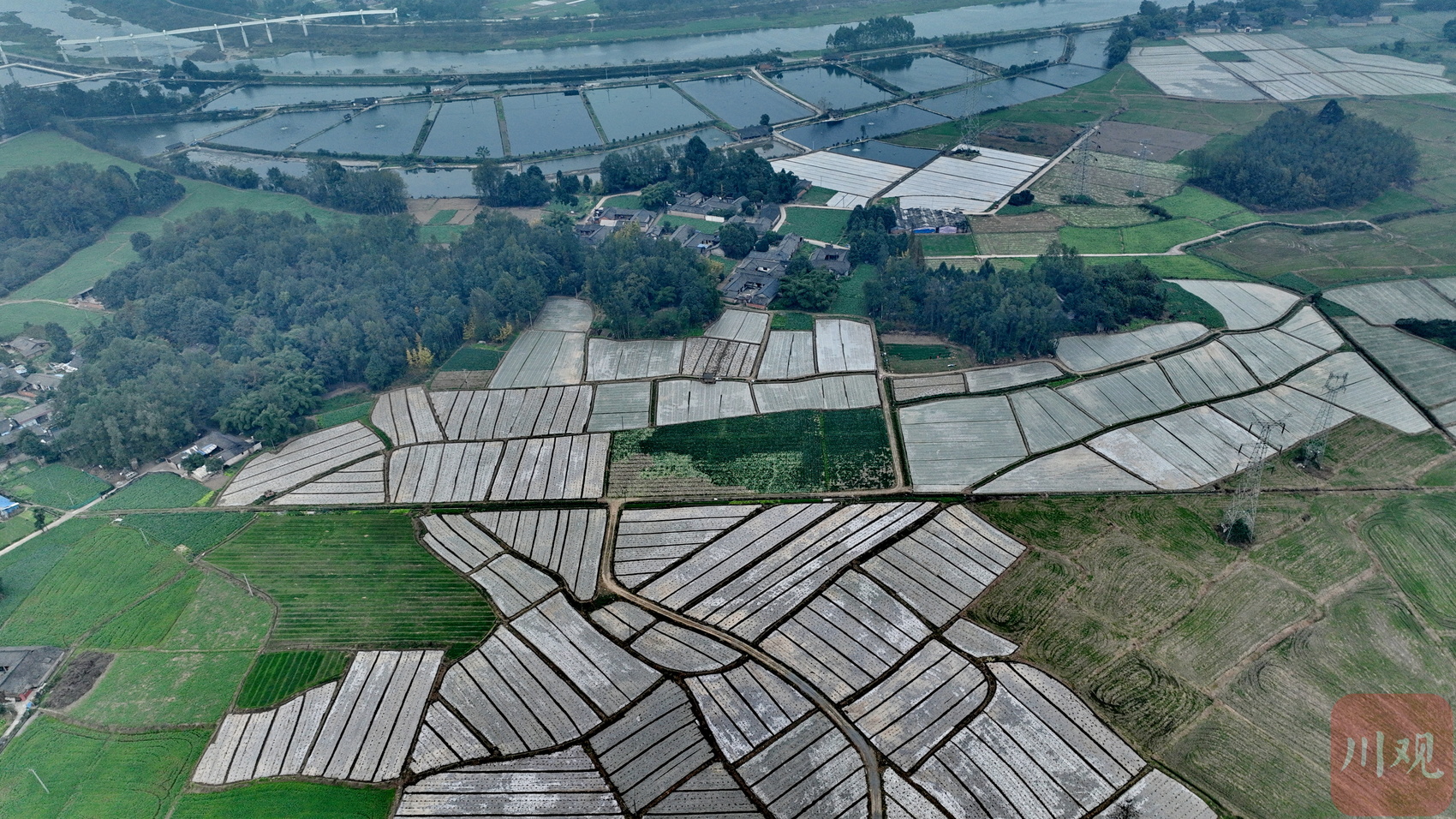俯瞰大邑县一块块农作物犹如彩色的地毯。