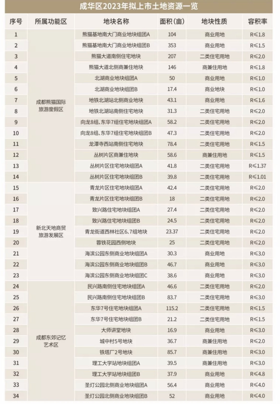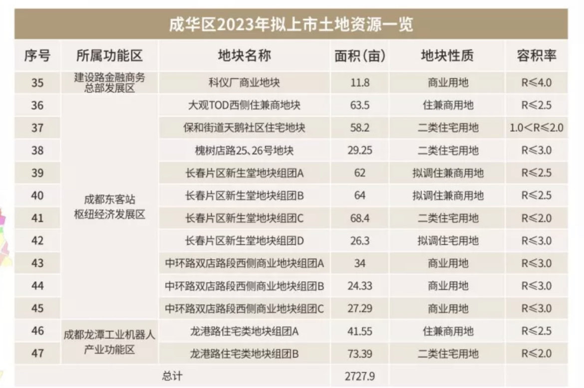 12月8日,成都市成华区举行了“2022年成都市成华区城市价值推介会”(以下简称“推介会”),公布了2023年供地计划,拟上市47宗优质土地,包含22宗纯住宅用地(其中1宗为拟调为住宅用地)、16宗商业用地、4宗住兼商用地(其中2宗为拟调为住兼商用地)、5宗商兼住用地,合计面积约2728亩,分别位于新北天地商贸旅游发展区、东郊记忆艺术区、建设路金融商务总部发展区、成都熊猫国际旅游度假区、龙潭工业机器人产业功能区、成都东客站枢纽经济发展区六大功能区。