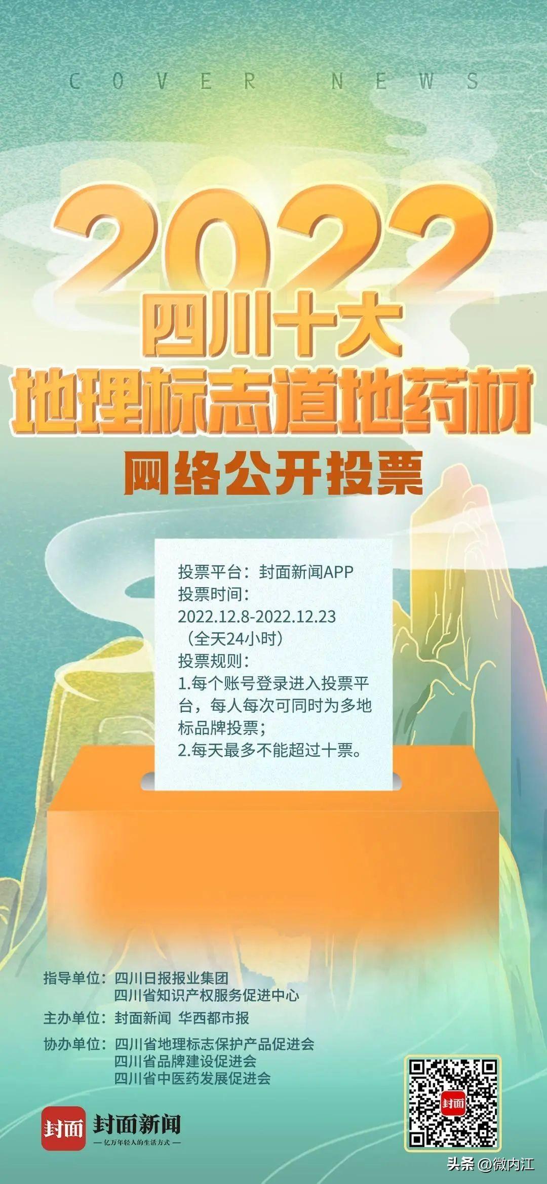 12月8日,在四川省知识产权服务促进中心、四川日报报业集团共同指导下,由封面新闻、华西都市报主办的2022“四川十大地理标志道地药材”评选活动正式启动,该活动围绕全省62个地理标志中药材,重点讲述四川地理标志道地药材的地标故事、推介地标知名品牌、传播地标特色文化。