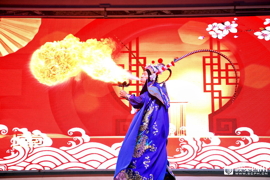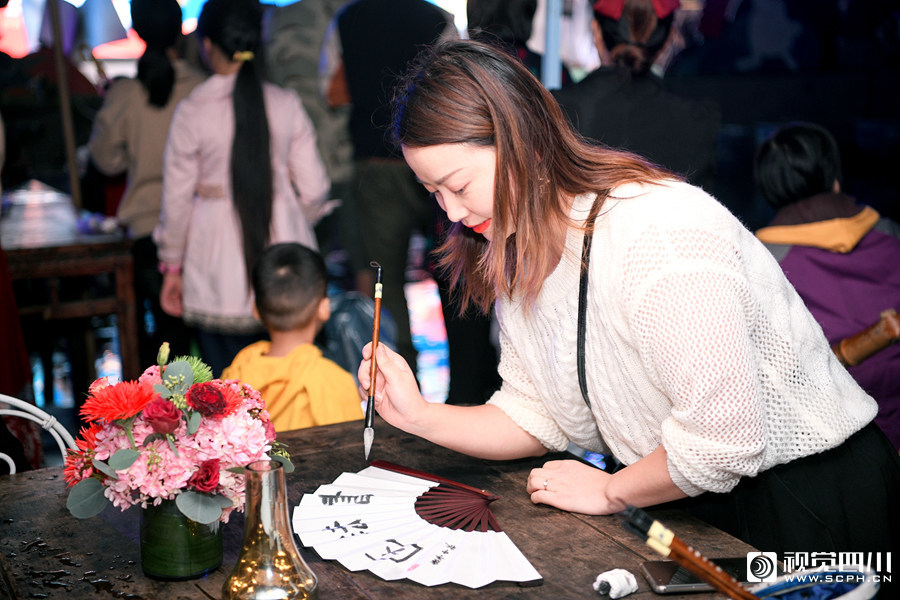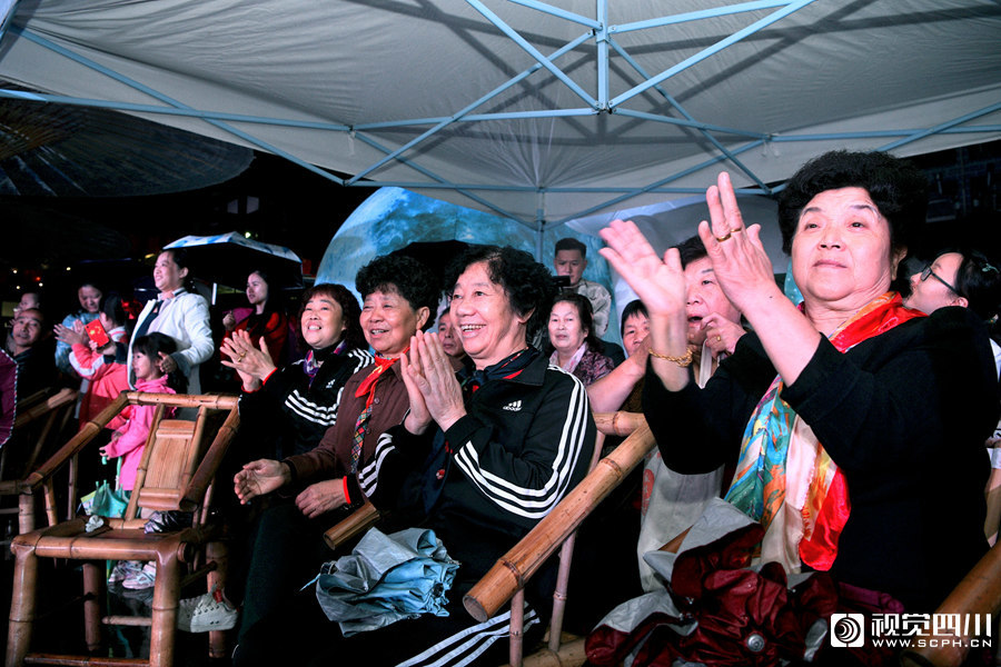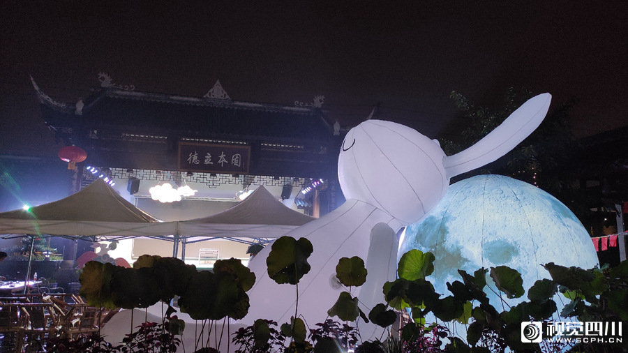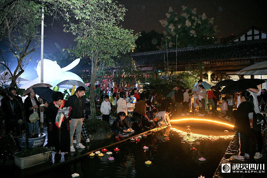 人们一边品尝着月饼,一边品味着古风曲韵,茶艺师们手中的长嘴铜茶壶有生命力的飞舞旋转着,川剧演员也在现场表演着川剧变脸、吐火……演出结束后,市民们跟随身着汉服的礼仪人员共同拜月祈福,放逐花灯,大家共同为国泰民安,家庭顺遂许下美好祝福。