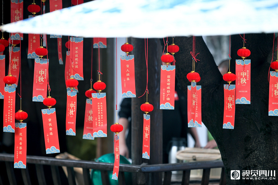 记者看到,被彩灯和灯笼包裹的活动现场人头攒动,充满古风韵味的集市吸引了不少身着汉服的年轻男女。现场还摆放着巨型月亮和玉兔,供市民们留影拍照。绘画区,三三两两的小朋友们正在团扇上自由绘画,走廊边,邻里街坊们正对着树上的灯谜扶头思索,猜出谜底的那一刻,大人们开心的像个孩子欢跃着兑换着礼品。