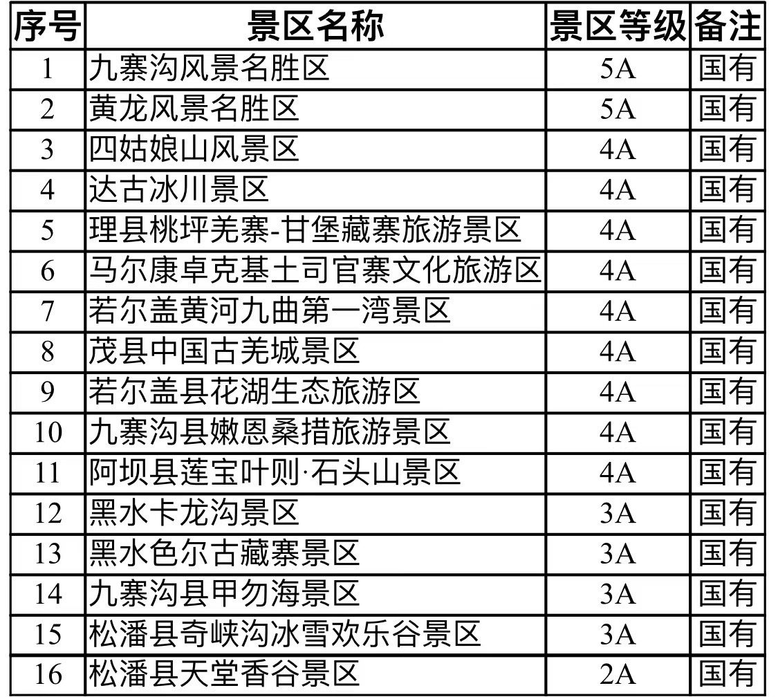 16家免收门票景区名单:九寨沟风景名胜区、黄龙风景名胜区、四姑娘山风景名胜区、达古冰川风景名胜区、理县甘堡藏寨—桃坪羌寨旅游景区、马尔康市卓克基土司官寨文化旅游景区、若尔盖县黄河九曲第一湾景区、若尔盖县花湖生态旅游区、茂县中国古羌城景区、九寨沟县嫩恩桑措旅游景区、阿坝县莲宝叶则·石头山景区、黑水县卡龙沟景区、黑水县色尔古藏寨景区、九寨沟县甲勿海景区、松潘县奇峡沟冰雪欢乐谷景区、松潘县天堂香谷景区。