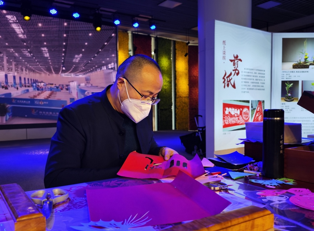 眉山市市级非遗东坡剪纸第四代传承人、眉山市民间文艺家协会副秘书长 彭德平现场剪纸展示