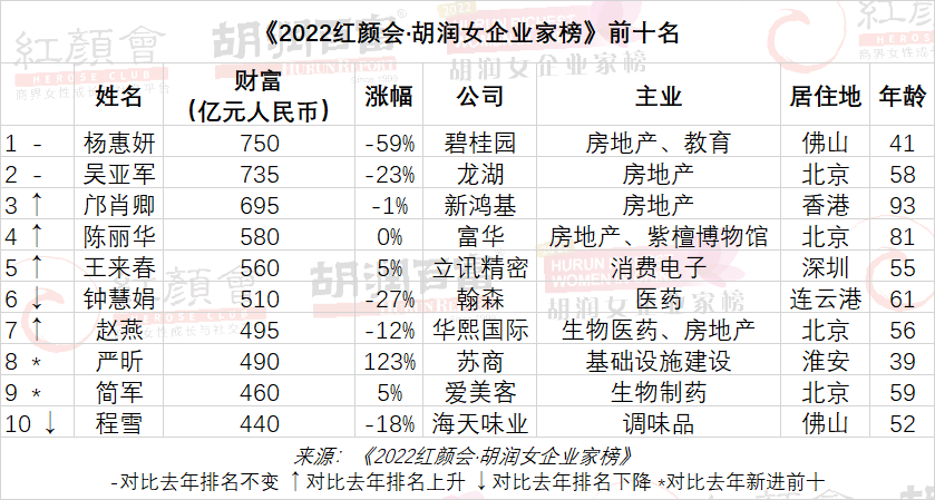前十名门槛比去年下降95亿元,至440亿元。涉足房地产行业的有5位,前十名男企业家中仅1位涉足房地产。碧桂园41岁的杨惠妍财富下降59%,以750亿元第十次成为中国女首富。龙湖58岁的吴亚军财富下降23%,以735亿元保持第二,并蝉联中国白手起家女首富。新鸿基93岁的邝肖卿以695亿元财富首次进入前三,比去年上升2位。