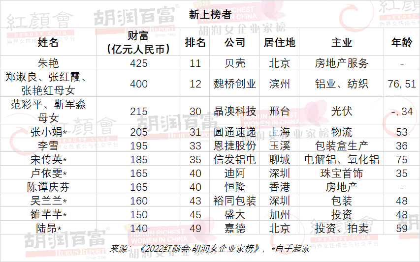与胡润百富榜总榜不同,女企业家榜单独计算那些能够从家族财富中剥离出的女企业家的个人财富。财富计算的截止日期为2022年9月15日。这是胡润研究院连续第十七次发布此榜单。